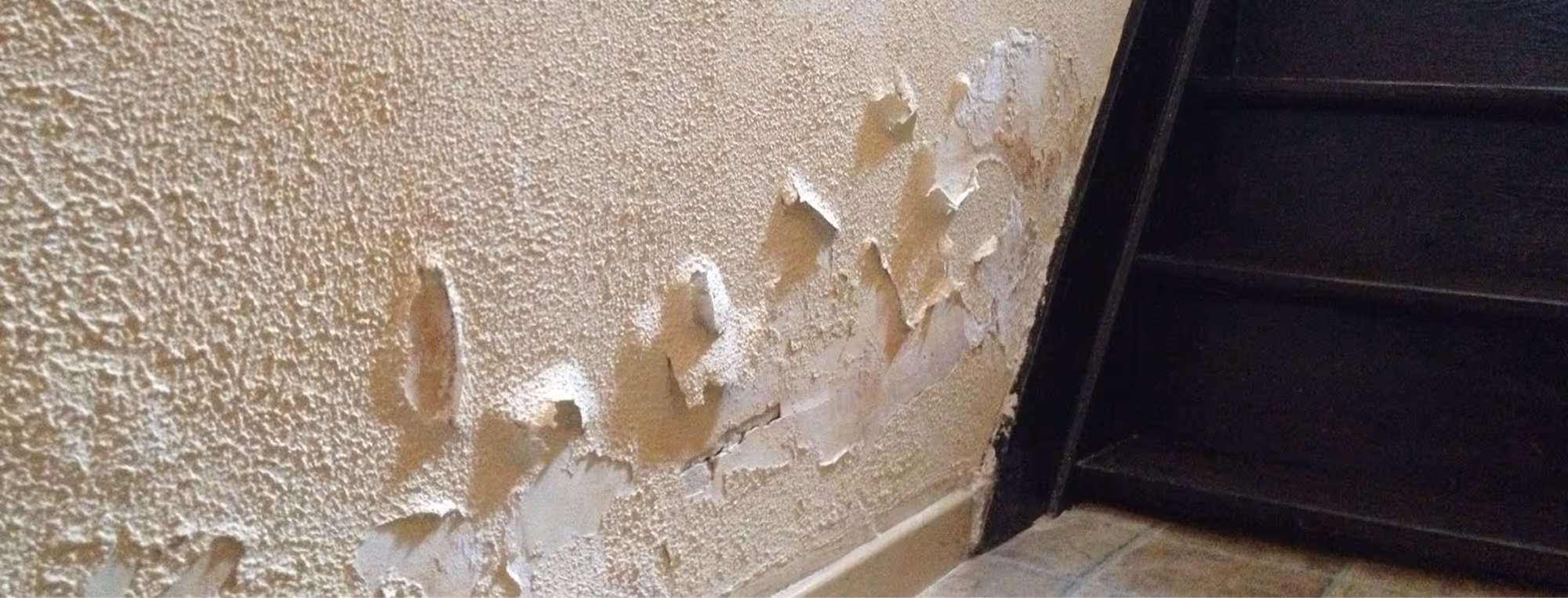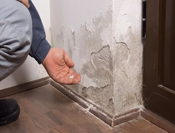Je ziet meestal afbladderende verf, vochtige plinten of zouten in de muur.